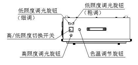 低照度调光:将高/低照度切换开关按到低照度端,旋转低照度调光的粗调和细调旋钮。